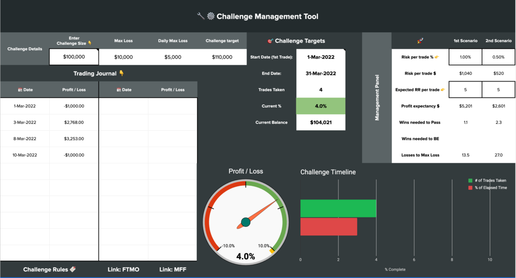 The spreadsheet will automatically calculate your running profit/loss, how many trades you've taken, and when your challenge finishes.